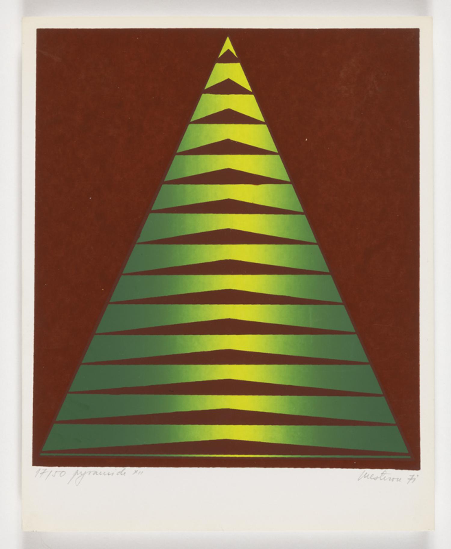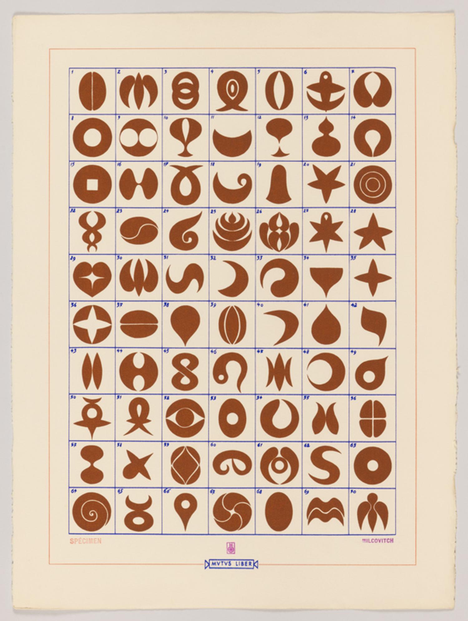 François Paul-Cavallier, fondateur des éditions de la Tortue, a promu de nombreux artistes au cours de sa carrière de galeriste. En 2025, il fait don de plus de sept cent cinquante estampes et dessins et, parmi ceux-ci, environ cent quarante œuvres du couple d’artistes Maria Mesterou et Mircea Milcovitch. Tous les deux nés en 1941, la première en Roumanie et le second en ancienne Bessarabie (entre la Moldavie et l’Ukraine), ils étudient à Bucarest. Ayant voyagé de nombreuses fois dans les Carpates, ils ont été marqués par une certaine spiritualité. Dans les années 1970, ces deux artistes décident de fuir le communisme et s’installent à Paris. Là-bas, ils collaborent avec les Editions de la Tortue et pratiquent majoritairement la sérigraphie. Par leur travail, ce couple nous invite à rencontrer leur univers partagé, dans lequel les signes remplacent les mots. A travers leurs œuvres colorées, aux symboles directement inspirés de la nature, ils divulguent l’irrévélable à ceux qui sont « [disposés] à se concentrer dessus pendant une période prolongée[1]».